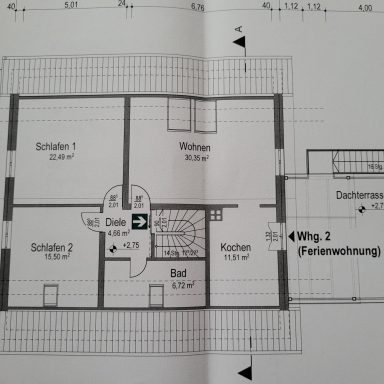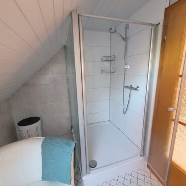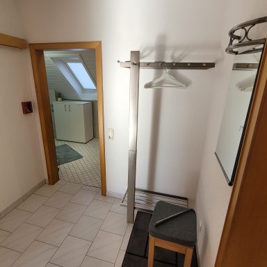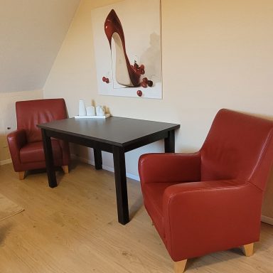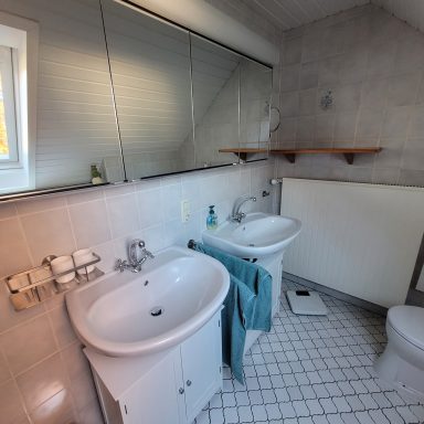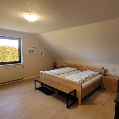 Die 90 m² große helle Ferienwohnung im Obergeschoss ist über die mit Sitzgruppe ausgestatte Terrasse zu erreichen. Sie bietet 2 separate Schlafzimmer mit einem Doppelbett und einem Einzelbett.