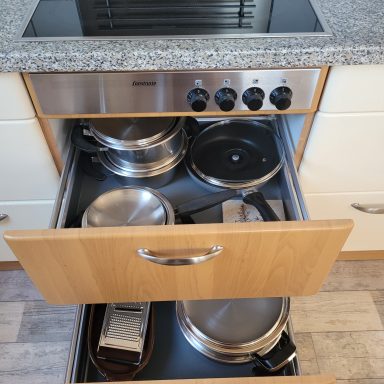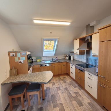 In der Einbauküche finden Sie neben allem nötigen Interieur eine Filter-Kaffeemaschine, Spülmaschine, Mikrowelle und Backofen sowie einen Kühlschrank mit Gefrierfach.